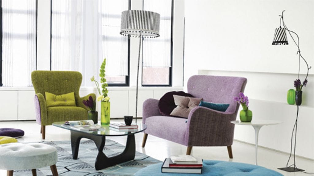 Designers Guildin retrohenkiset Festival Club Cair -nojatuolit ja -rahit on päällystetty Designers Guildin vakosamettimaisella Cascina-kankaalla, leveys 140 cm, 71 euroa/m.