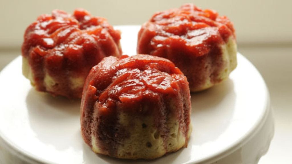 Voitele metallimuotit voilla ja lisää jokaisen muotin pohjalle pieni loraus grenadiinisiirappia sekä 1/2 rkl tummaa sokeria. Laita niiden päälle mansikkaviipaleita niin, että metallivuoan pohja täyttyy. Täytä loput muotista taikinalla ja laita muotit uniin 180 asteeseen, noin 30 minuutiksi.