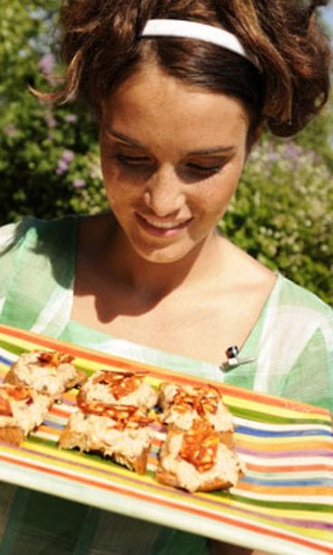 Lisää tonnikalatäytettä leipäpalojen päälle ja koristele leivät suikaloidulla chorizomakkaralla.