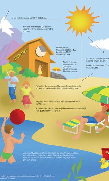 UV-indeksi eli UVI ilmoittaa auringon UV-säteilyn määrän yhdellä luvulla. Suojautumistarve alkaa indeksin saavuttaessa arvon kolme. Tämä tapahtuu Etelä-Suomen aurinkoisena päivänä yleensä noin kymmeneltä aamulla. Iltapäivällä raja alitetaan taas suunnilleen viiden aikaan. Klo 10-17 on siis tarpeen huolehtia saamastaan säteilyannoksesta. Muistamista helpottaa kolmiportainen VVV-ohje: