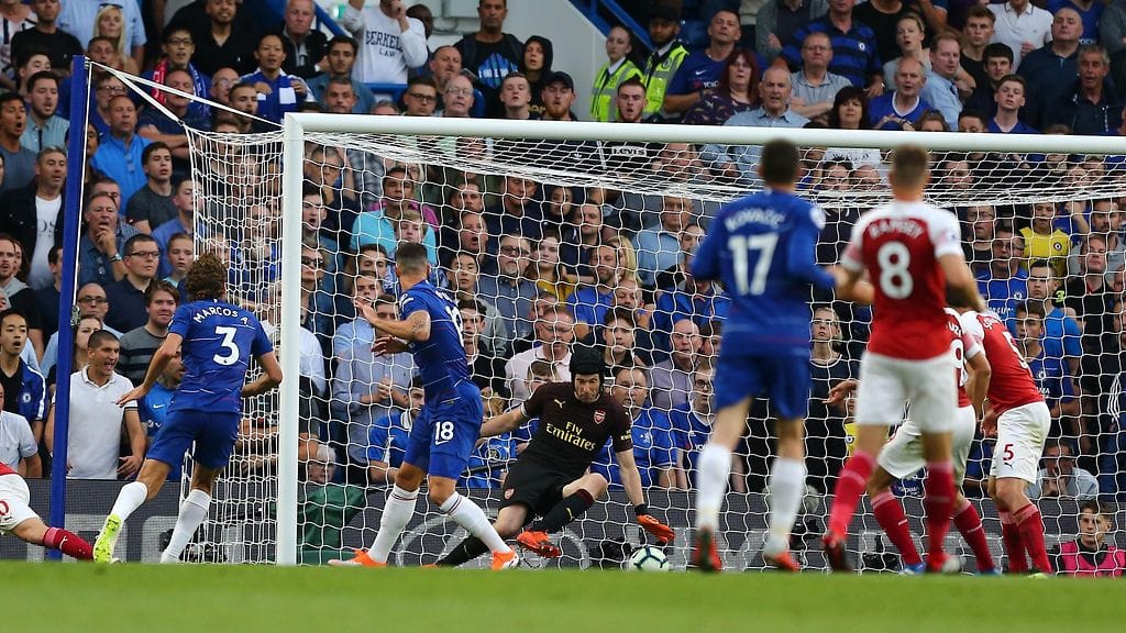 Trillerin maalikorkki aukesi, kun Chelsean Jorginho tarjoili Marcos Alonsolle vasemmalla korkean pystypallon, ja Pedro Rodriguez kiiti samaan aikaan keskeltä rangaistusalueelle. Alonso jakoi täydellisen matalan syötön pilkun tienoille ja Pedro paukautti sinipaidat 1–0-johtoon.