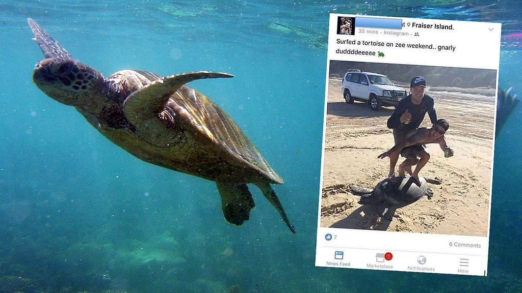 Nuori mies aiheutti kohun jakamalla Instagram-palvelussa kuvan, jossa hän seisoo kaverinsa kanssa kilpikonnan päällä Fraser Islandilla Australiassa. Mies kirjoittaa kuvan yhteydessä surffaavansa kilpikonnalla.