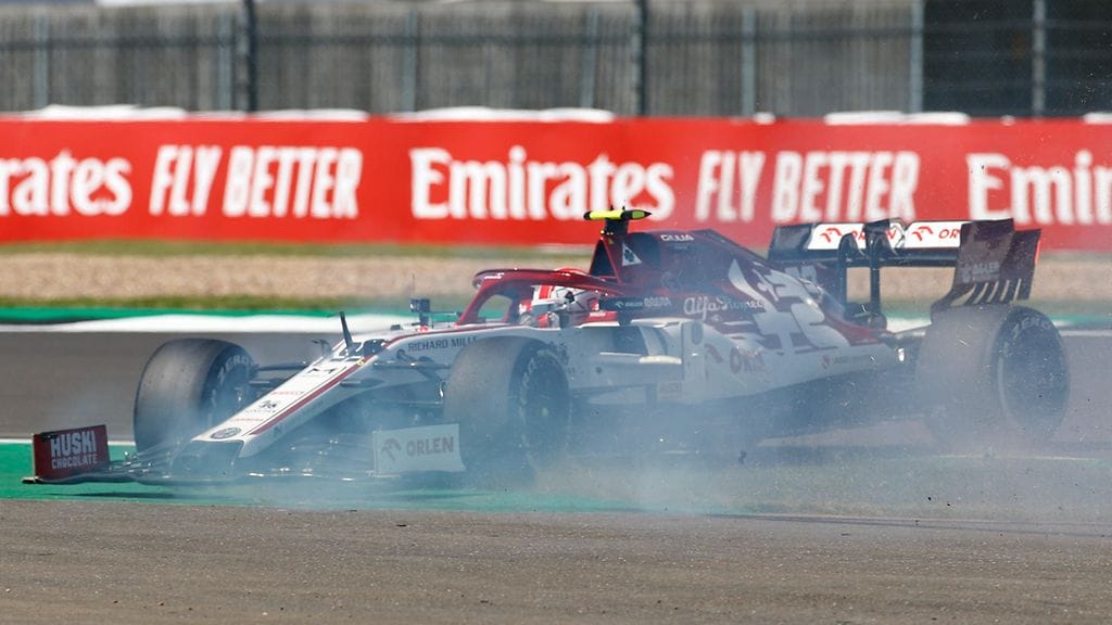 Alfa Romeon autoilla oli Britannian ensimmäisissä F1-harjoituksissa vaikeuksia pysyä radalla. Kimi Räikkönen pääsi helpommalla, mutta tallikaveri Antonio Giovinazzin toimet otettiin aina tuomariston tutkintaan asti.