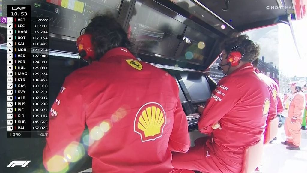 Ferrari sen sijaan teki tallimääräyksen kisan alussa kärkeen nousseelle Sebastian Vettelille. Italialaistalli viestitti, että Vettelin pitäisi antaa tietä toisena olevalle Charles Leclercille.