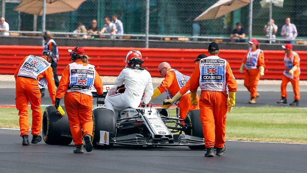 Alfa Romeon suomalaiskuski Kimi Räikkönen koki epäonnea Ison-Britannian GP:n ensimmäisissä vapaissa harjoituksissa, kun hänen autonsa moottori sanoi sopimuksen irti. Räikkönen ikuistettiin lopulta sangen hulvattoman hetken keskelle.