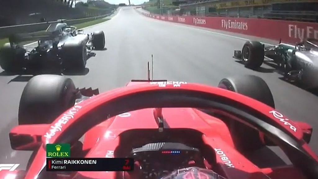 Räikkönen harvemmin juhlii startissa, mutta Itävallassa hän ampaisi matkaan kuin tykin suusta. Neljännestä ruudusta lähtenyt Räikkönen oli avausmutkassa toisena Mercedeksen Lewis Hamiltonin jälkeen.