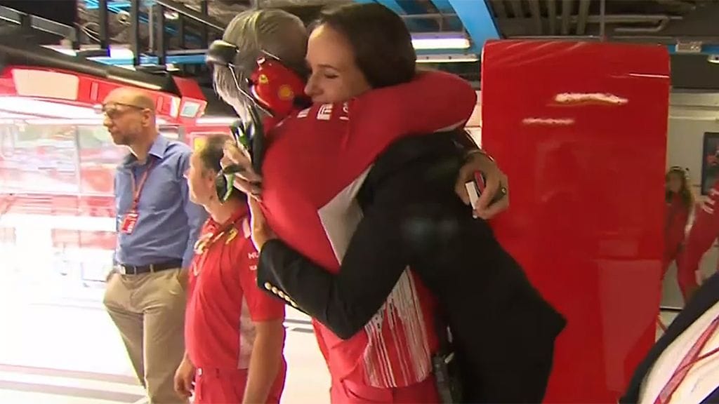 Tämä käynnisti hurjat juhlat Ferrarin pilttuussa. Räikkösen Minttu-vaimo itki miehensä huippusuoritusta, ja tallipomo Maurizio Arrivabene otti Minttu Räikkösen lämpimään rutistukseen.