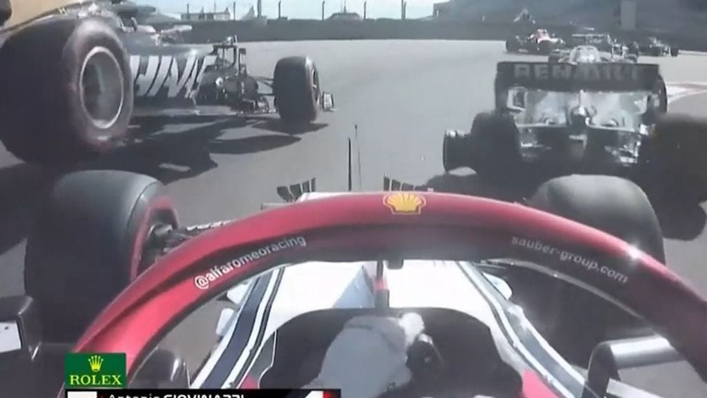 Venäjän F1-kisan startissa paikkoja hakeneet kuskit eivät välttyneet yhteentörmäyksiltä hakiessaan asemaansa radalla. Alfa Romeon Antonio Giovinazzilla kävi tuuri hänen jäätyään kahden auton väliin.