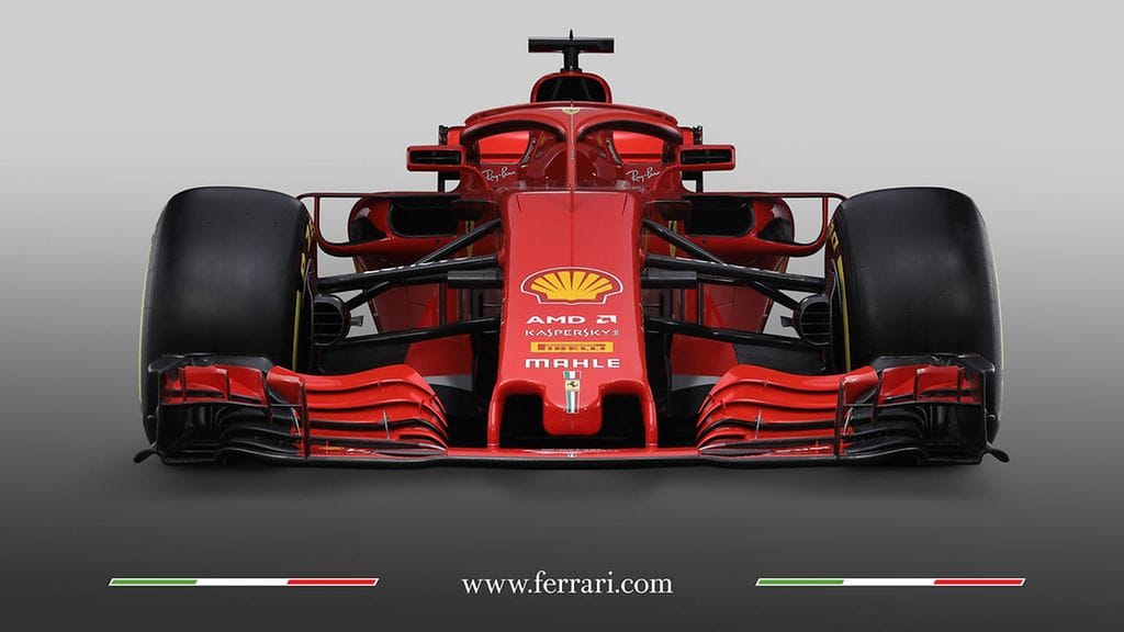 Kimi Räikkösen ja Sebastian Vettelin kuljettama SF71H on väritykseltään punaisempi kuin viime kauden auto – uutta Halo-turvakaarta myöten.