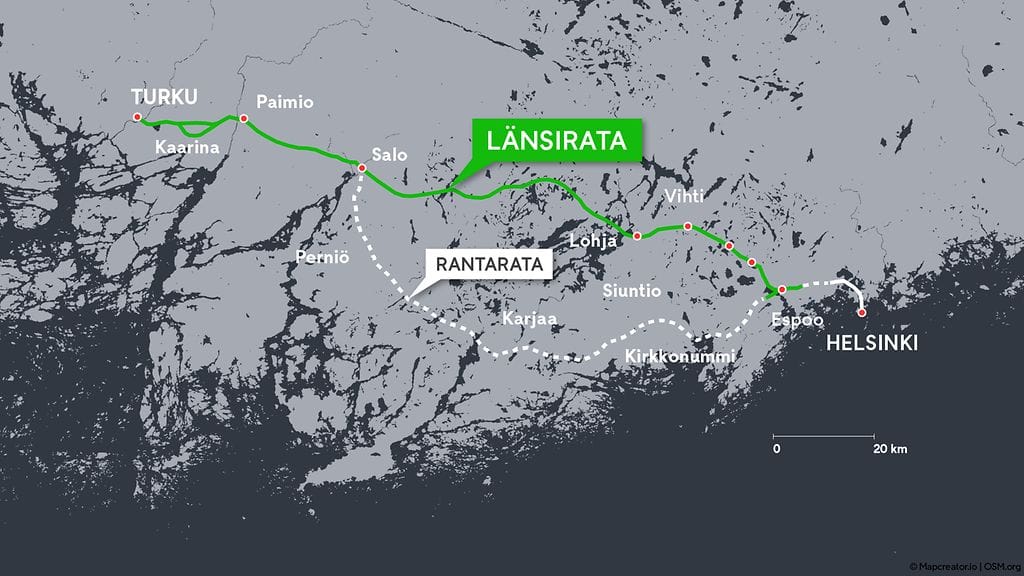 Länsirata kulkisi Helsingistä Espoon, Veikkolan, Vihdin, Lohjan ja Salon kautta Turkuun.