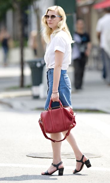 Söpö ja nuorekas Dunst oli pukeutunut farkkuhameeseen ja valkoiseen, edestä sidottavaan paitaan. Tähden asukokonaisuus sekä laineikas hiustyyli ja tyylikkäät aurinkolasit hehkivät 1950-luvun romantiikkaa. Hempeäväriseen asuun väripilkun toi punainen käsilaukku.