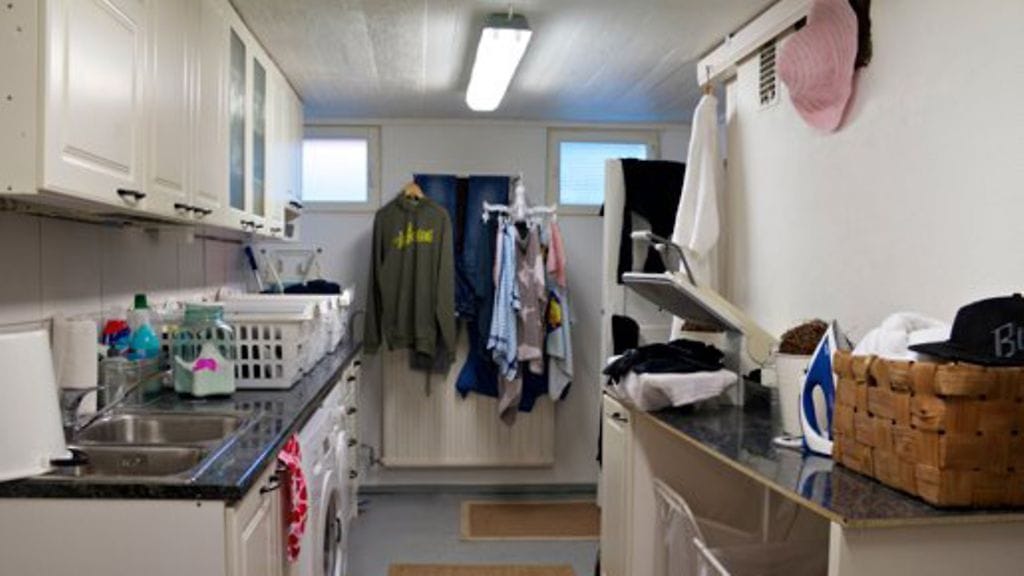 50-luvulla rakennetun omakotitalon kellarissa sijaitsevan kodinhoitohuoneen suunnitteli perheen äiti Katja ja toteutti isä Sami. Talossa ei ollut lainkaan tilaa pyykinhuollolle, kun kuusihenkinen perhe muutti sinne kaksi vuotta sitten.