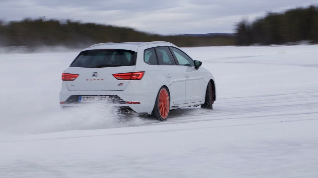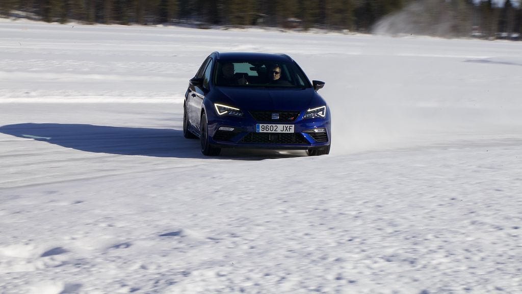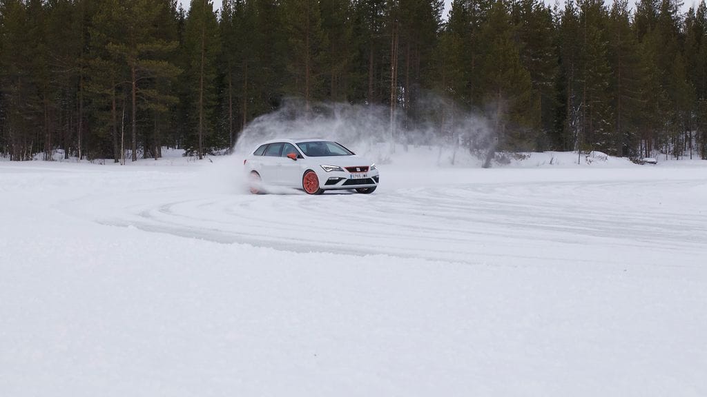 Pääsimme tutustumaan Leon Cupran nelivetoiseen versioon aikaisemmin keväällä Espanjan lämmössä. Kuivalla alustalla ero etuvetoiseen jää vähäiseksi, mutta Suomen talvisissa olosuhteissa ero on ymmärrettävästi kuin yöllä ja päivällä. Pääsimmekin haastamaan tehofarkun ominaisuuksia kunnon jääradalla mestari Kankkusen opeissa.