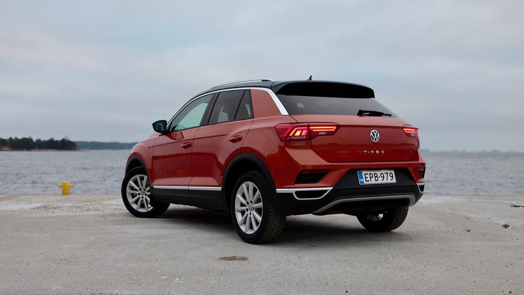 Uutuusmalli T-Roc sijoittuu tällä hetkellä kovassa nosteessa olevaan kompaktien katumaasturien luokkaan. Muodoissa on sopivasti särmää ja etenkin takaosan muotoilussa on painotettu myös linjakkuutta. Osittain tämä on tehty myös käytettävyyden ehdoilla, sillä viisto takalasi ja C-pilarit pienetävät tehokasta tavaratilaa ja heikentävät takanäkyvyyttä. Perän korkeus puolestaan kostautuu hyvin korkean tavaratilan nostokynnyksen muodossa, joten painavampien esineiden kuljettaminen ei käy ihan itsestään.