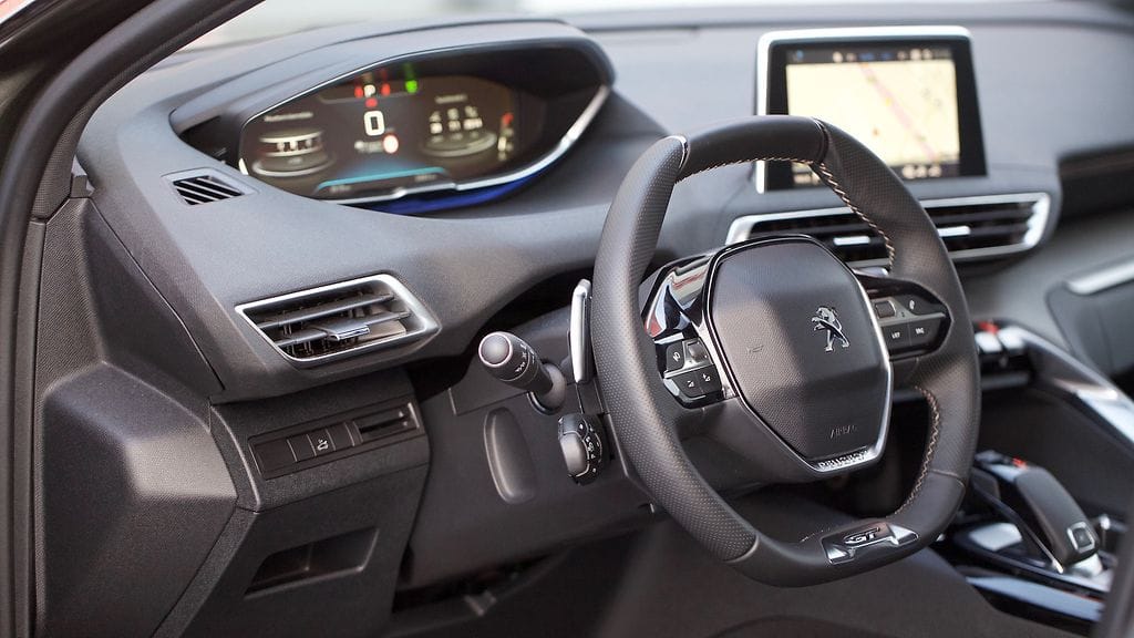 Persoonallisuus jatkuu myös sisällä. Kuljettajan ympäröi Peugeotin i-Cockpit-nimellä kutsuma ohjaamoratkaisu, jossa mittaristo sijaitsee lähellä tuulilasia, ja kuljettaja katselee 12,3-tuuman näytöllä toteutettua digitaalista mittaristoa ohjauspyörän kehän yläpuolelta. Ohjaamofilosofiaan kuuluu myös kevyesti kuljettajaa kohti käännetty keskikonsoli, jonka keskipisteenä toimii 8-tuumainen kosketusnäyttö. Kokonaisuus on varsin tyylikäs, mutta samalla myös kiitettävän toimiva. Tyylikkäiden materiaalivalintojen lisäksi viimeistely ei jätä moitteille sijaa.