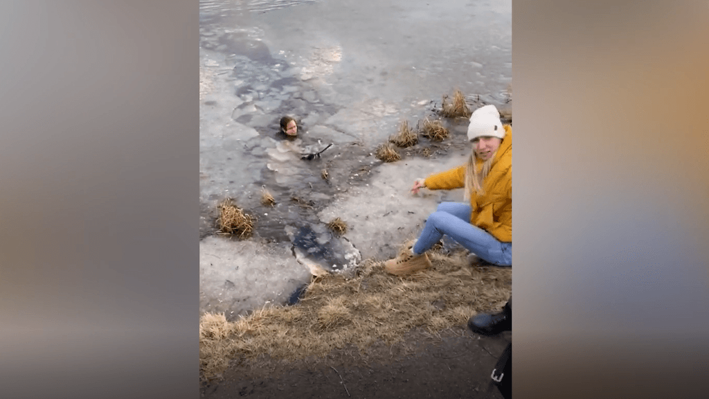 Rohkea venäläisnainen hyppäsi ohuen jään peittämään lampeen pelastamaan hukkuvan koiransa.