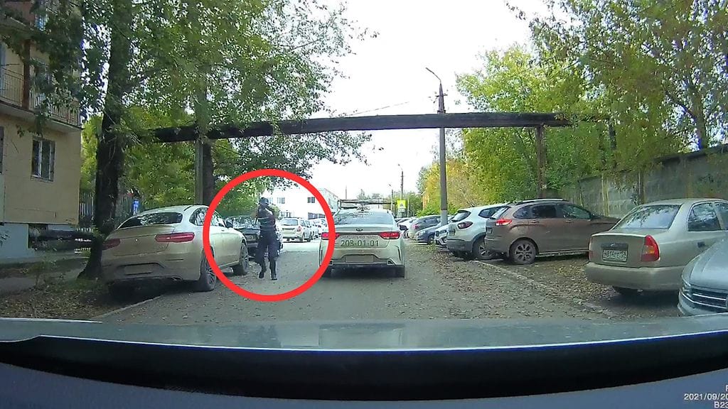 Kojelautakameralle tallentui hyytävä tilanne, kun autoilija ajoi hidasta vauhtia kadulla. Tienvarressa olevien autojen välistä ilmestyi yhtäkkiä mies metsästyskiväärin kanssa.
