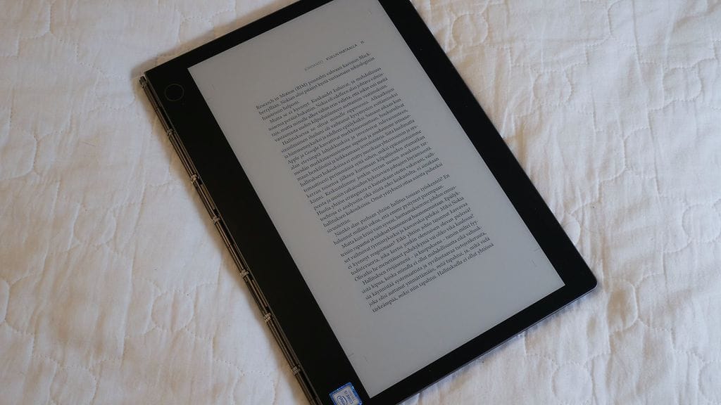 Lukutoukille E Ink -näyttö on varmasti mukava juttu. E-kirjoja on miellyttävä lukea E Ink -näytöltä eivätkä silmät rasitu samaan tapaan kuin LCD- tai AMOLED-näytöillä. PDF-muodossa olevat e-kirjat saa näppärästi pyöräytettyä Yoga Book C930:n kakkosnäytölle.