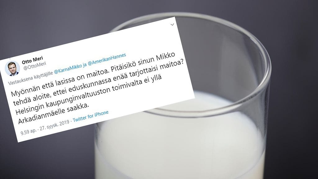Helsinkiläinen kaupunginvaltuutettu Otto Meri (kok.) haluaa lopettaa maidon tarjoamisen Helsingin kaupungin tiloissa. Kotisivuillaan löytyvässä kuvassa valtuutettu poseeraa kuitenkin itse maitolasillisen äärellä.