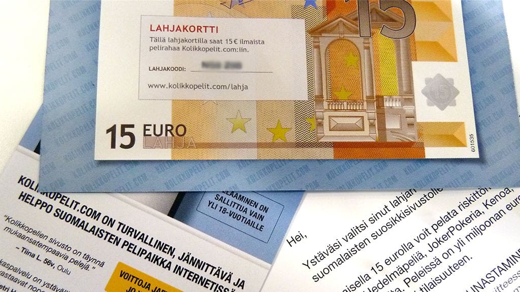 Lisäksi pelisivu kertoo kirjeessä, että "ystäväsi pyysi meitä lähettämään sinulle 15 €".