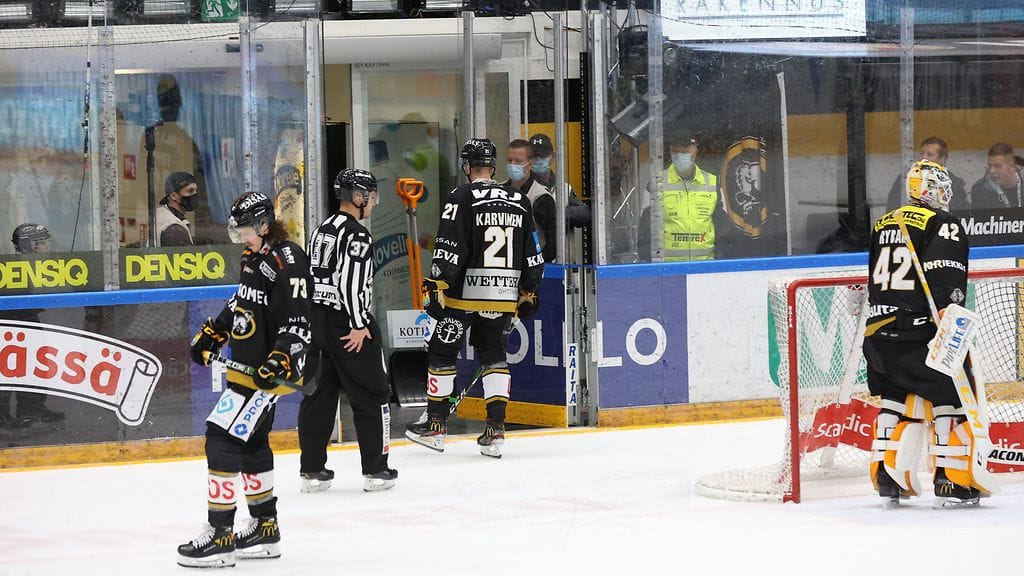 Karvinen taklasi päätöserässä laidasta irti ollutta HIFK:n Rony Ahosta, joka ei pystynyt jatkamaan ottelua tilanteen jälkeen.