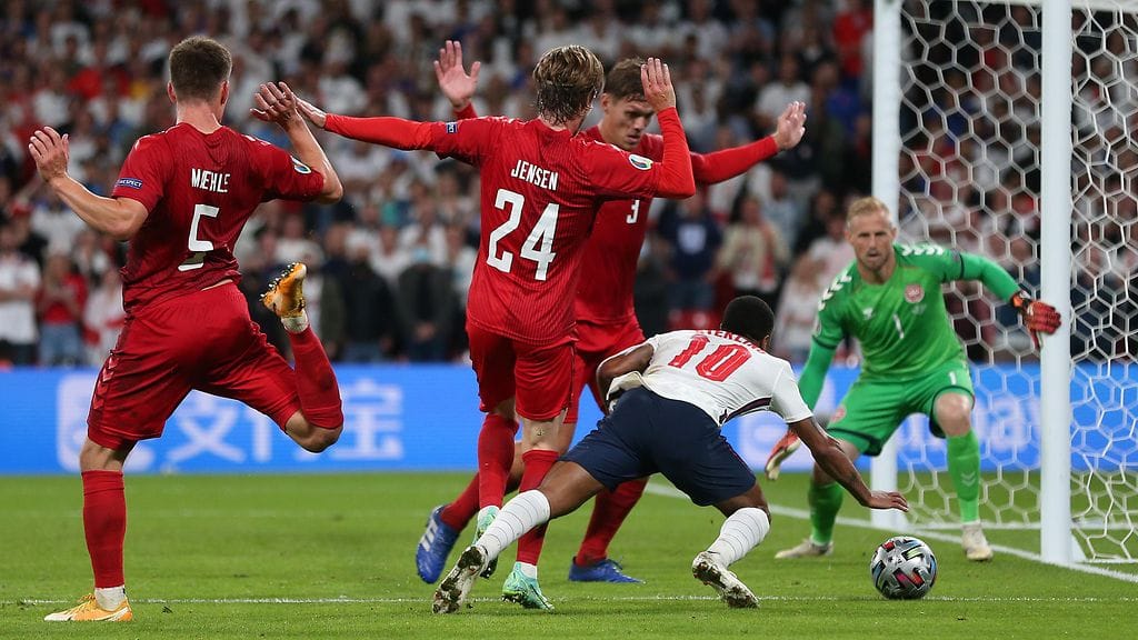Kontakti rangaistusalueelle rynnistäneen Englannin Raheem Sterlingin ja häntä estelleen kahden tanskalaispelaajan välillä oli olemassa. Aivan toinen kysymys on se, johtuiko englantilaistähden kaatuminen todella siitä kontaktista.