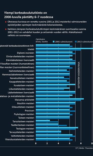 Selvästi yli seitsemän vuoden opiskeluaikoja näkyy vain muutamilla aloilla, esimerkiksi arkkitehtitutkinnossa. Toisaalta juuri ongelmallisimmilla aloilla valmistumisajat ovat verkkaisesti lyhentyneet, yliopistoista todetaan.