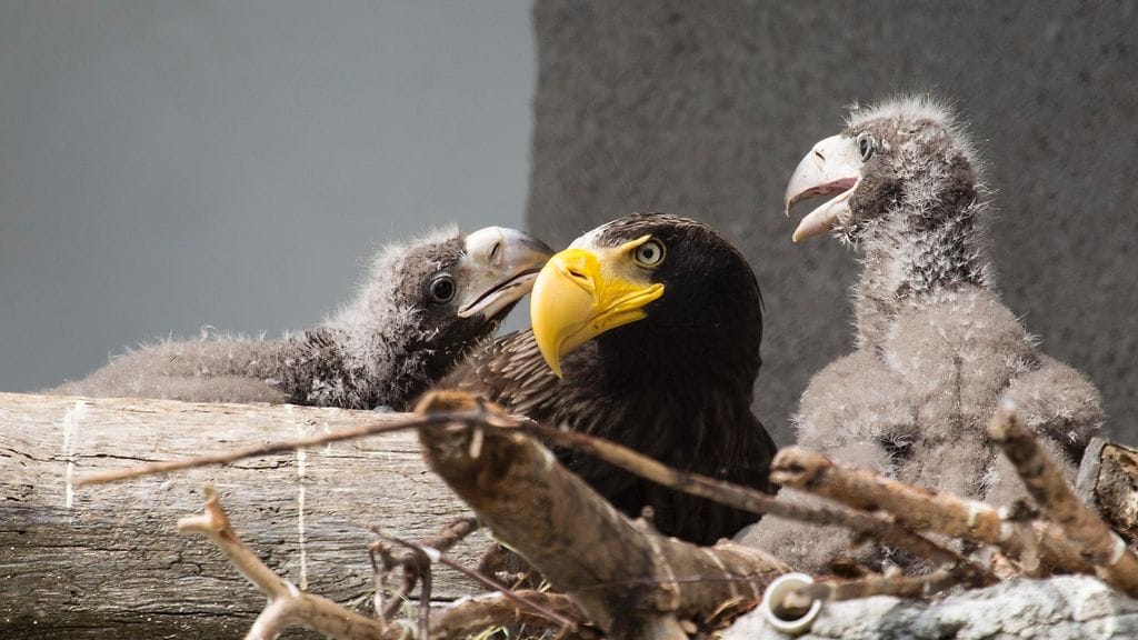 Korkeasaaren kuningasmerikotkat ovat saaneet ensimmäiset poikasensa. Toukokuun puolessa välissä kuoriutuneet kaksi poikasta ovat nyt kotkapariskunnan tarkassa hoivauksessa Karhulinnan viereisessä suuressa lentotarhassa.