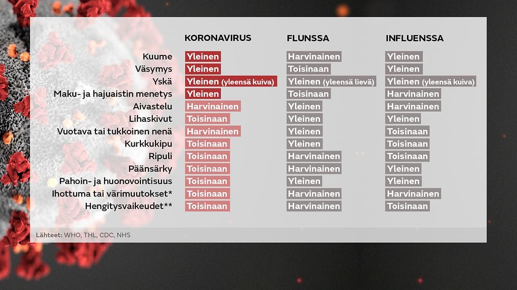 Koronaviruksen, influenssan ja flunssan oireet voivat muistuttaa toisiaan, mutta myös eroavaisuuksia löytyy. Kokosimme yksinkertaisen grafiikan, jonka avulla voit arvioida, onko oireiden takana viheliäinen koronavirus vai kenties tavallinen syysflunssa.