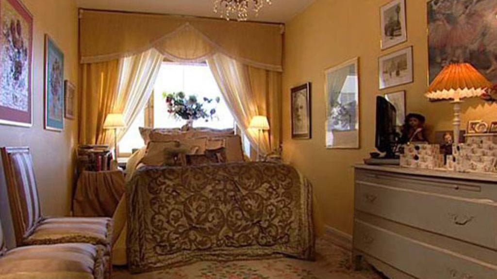 Makuuhuoneen pehmeä väritys on keltaista ja kultaa. Sängyn takana on ikkuna josta näkyy meri. Tekstiilien ylelliset kuviot ja materiaalit vievät ajatukset pois arkipäivästä.