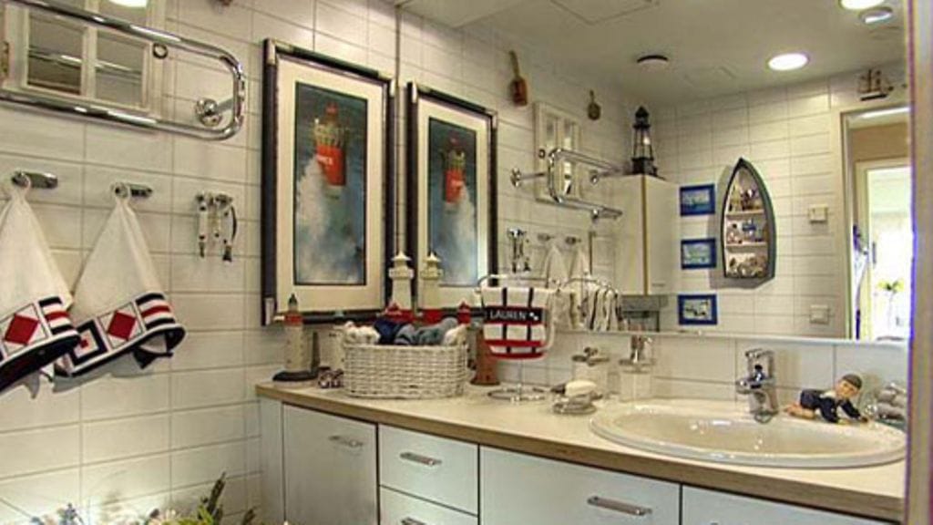 Sinivalkoinen keittiö on kodikas ja hauska. Valkoiset peruskaapistot katoavat näkyvistä kaiken mielenkiintoisemman tieltä. Verhokappa ja laskosverhot ovat Liisan suunnittelemat ja ne on teetetty kiinassa mittojen mukaan. Sinivalkoisen tapetin teksteissä on maailman eri kaupunkeja, mikä sopii paljon matkustavalle Liisalle erinomaisesti.
