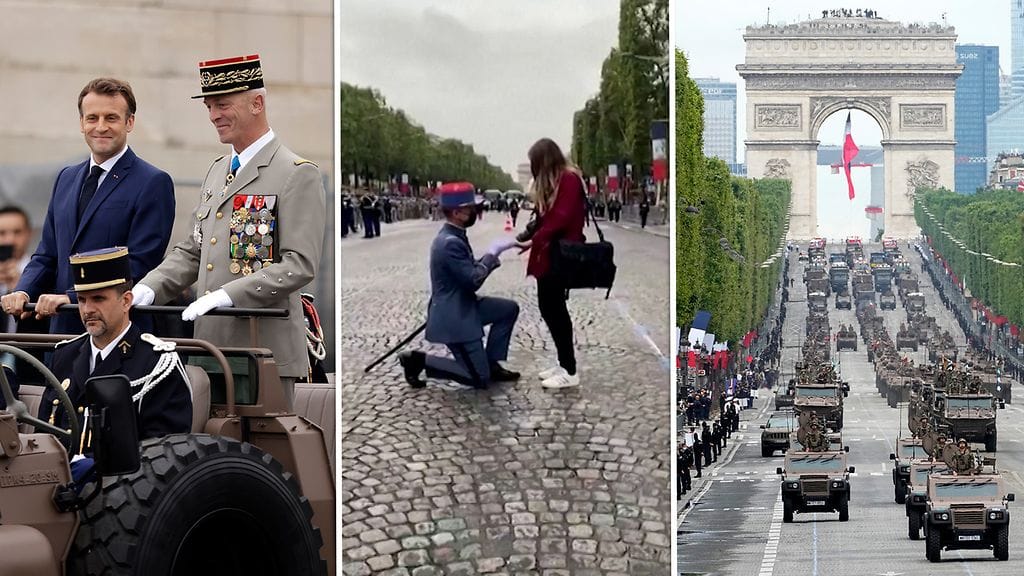 Ranskan vuosittaisen kansallispäivän sotilasparaatin keskellä nähtiin tänään tunteikas hetki, kun yksi alokkaista polvistui rakkaansa eteen juuri ennen presidentin saapumista.