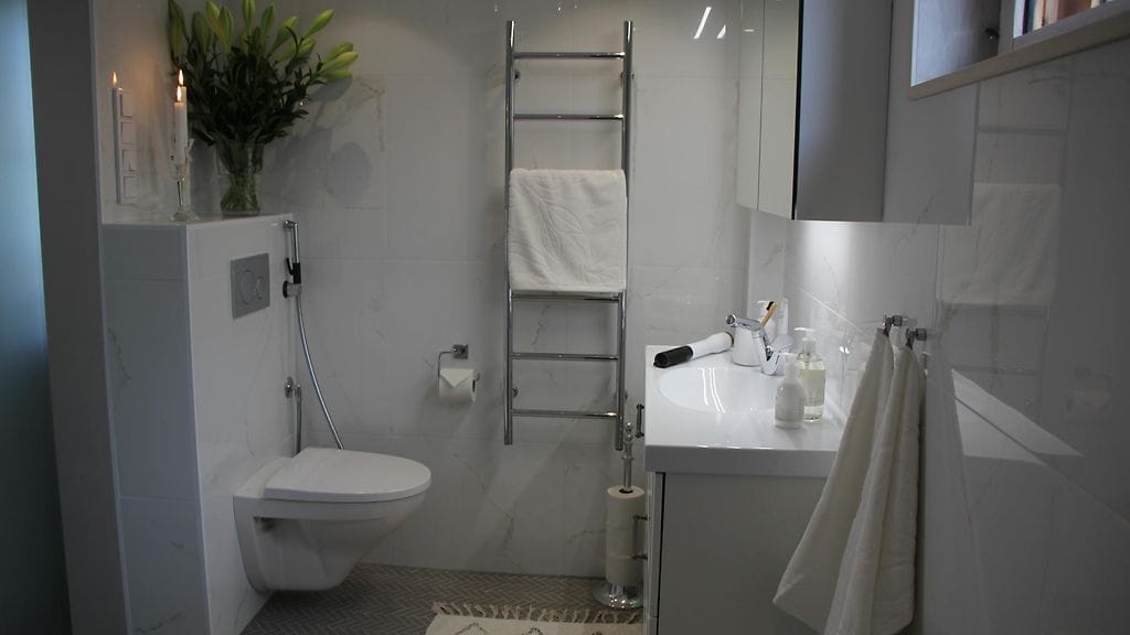 Ovi: Cecilia perusvalkoinen NCS 502 Y, Runko: valkoinen 01, Taso: 12mm komposiitti, valkoinen S028, New Country, Ticu-vedin, Real Country allaskaappi kahdella laatikolla, Rej-Design pyyhekuivain, Tango EH 35130 / 75W, Kromi