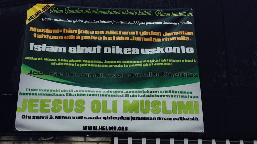 Roihuvuoren keskustaan on ilmestynyt noin viikko sitten iso banderolli, jossa mainostetaan islaminuskontoa suorin sanoin. ”Jeesus oli muslimi”, ”Jeesus ei ole Jumala vaan Jumalan lähettiläs” ja ”Islam ainut oikea uskonto”, lukee julisteessa muun muassa. Juliste roikkuu Roihuvuoren moskeijan seinällä.
