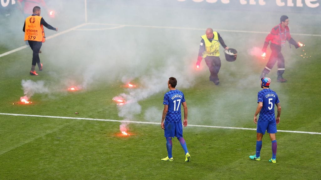 Kroatian ja Tshekin välinen jalkapallon EM-kisojen alkusarjan ottelu jouduttiin keskeyttämään reilut kaksi viikkoa sitten, kun krotialaishuligaanit heittelivät soihtuja kentälle.