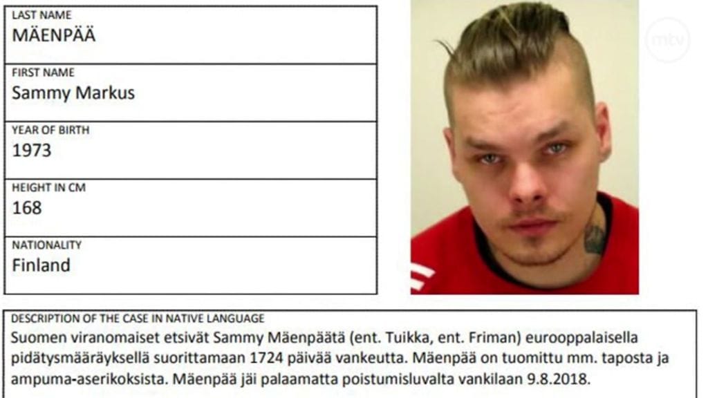 Yksi KRP:n listalla olevista suomalaisista etsintäkuulutetuista on Sammy Mäenpää, joka on tuomittu muun muassa taposta ja ampuma-aserikoksista. Keskusrikospoliisin mukaan Mäenpäällä on suoritettavanaan vielä 1724 päivää vankeutta, eli lähes viisi vuotta.