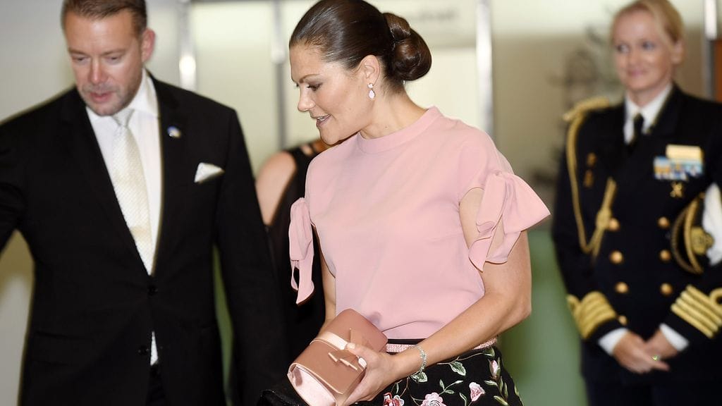 Sateisesta kelistä huolimatta hymyileväinen Victoria saapui tilaisuuteen hempeässä silkkipuserossa ja mustapohjaisessa kukkahameessa. Tyylin kruunasivat mustat avokkaat ja vaaleanpunainen käsilaukku.