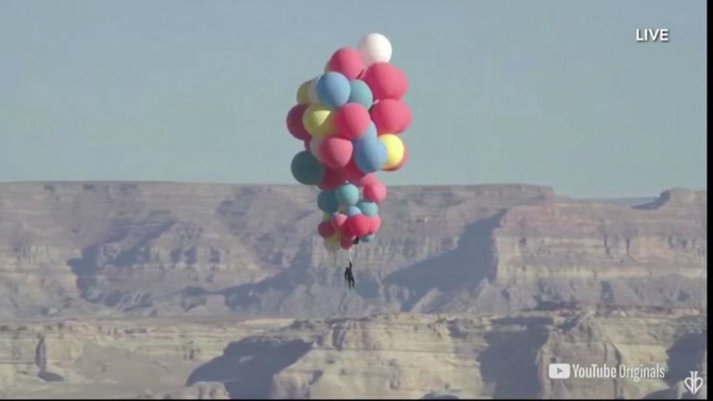 Kuin suoraan lastenpiirretystä Blainen ideana oli leijua ilmapallojen varassa kilometrien korkeuteen ja tulla sieltä uhkarohkeasti alas päästämällä ilmapalloista irti.
