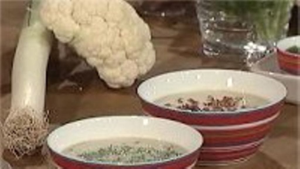Leikkaa purjo (käytä mieluiten purjon valkeaa osaa) ja kukkakaali paloiksi ja kuullota niitä hetki öljyssä, lisää vesi ja suola sekä pippuri. Keitä miedolla lämmöllä n. 20 min tai kunnes vihannekset ovat pehmeitä. Soseuta keitto tasaiseksi sauvasekoittimella ja lisää kerma. Kiehauta keitto ja tarkista maku. Lisää ruohosipuli ja persilja juuri ennen tarjoilua.