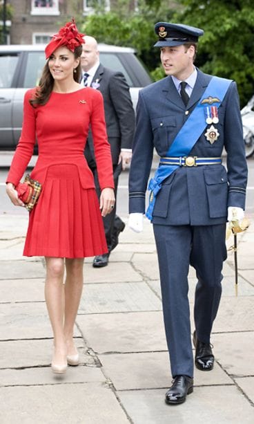 Hollywood-tähti Kim Kardashian, 31, ikuistettiin vuoden 2011 kesällä Alexander McQueenin näyttävässä punaisessa hihattomassa asussa. Sama asu nähtiin tuoreeltaan ikäsisaruksensa Cambridgen herttuatar Catherinen, 30, yllä kuningatar Elisabetin timanttijuhlissa. Katen punainen asu oli kuitenkin pitkähihainen versio ja kuninkaallisille juhlille tyypillisesti väreihin sointuvalla hatulla kruunattu.