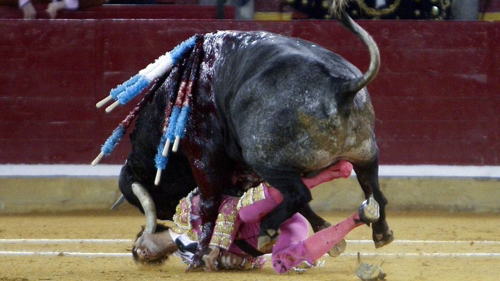 Tässä muutamia kuvia hetkistä, kun härkä on niskan päällä härkätaistelukaukalossa. Katseleminenkin saattaa tehdä kipeää.
