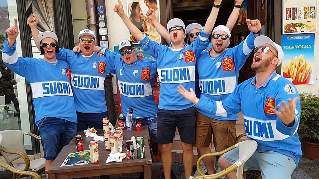Aurinko lämmittää Bratislavassa Suomen ja Kanadan MM-finaalipäivänä. Runsaslukuinen porukka Suomi-faneja on ällikällä lyötyjä Leijonien tarinasta.