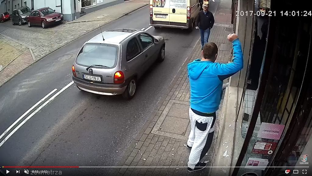 Oheinen video tallentui valvontakameraan Puolassa viime torstaina. Videolla nähdään kadulla kävelevä mies, joka on päättänyt ottaa asiakseen erään liikehuoneiston ikkunoiden hajottamisen.