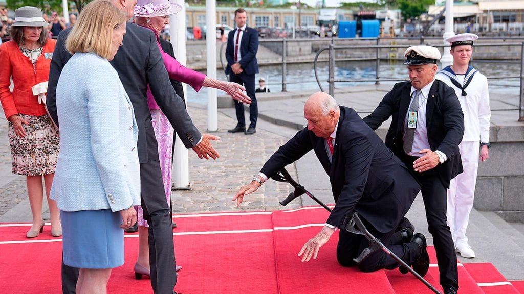 Harald oli juuri saapumassa tervehtimään Tanskan kuningatar Margareetaa, kun kuninkaan tasapaino petti ja hän kaatui polvilleen punaiselle matolle. Tilanteesta julkaistuista kuvista selviää, että kuninkaan turvamiehet olivat välittömästi auttamassa kuningasta jaloilleen.