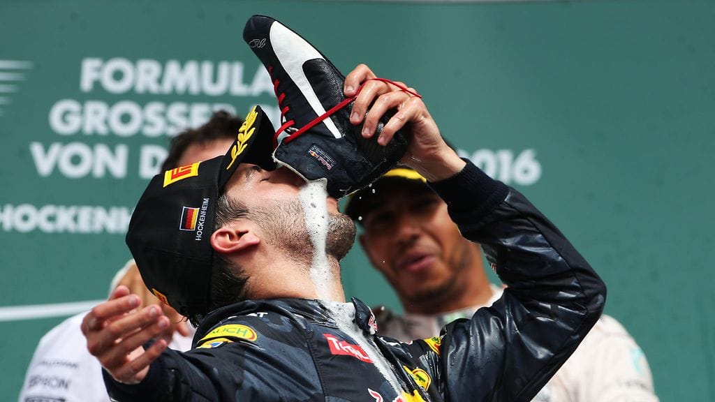 Ricciardo hämmensi Saksan GP:n palkintopallilla juomalla palkintojuomaa hikisestä kisalenkkarista.