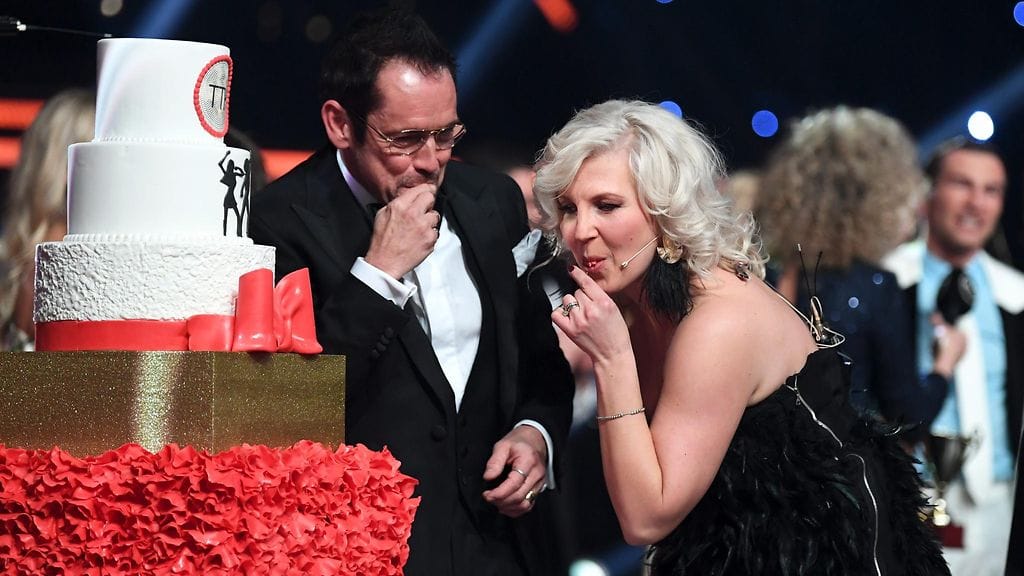 Vuoden 2018 Tanssii Tähtien Kanssa -voittajat Edis Tatli ja Katri Mäkinen pääsivät leikkaamaan isoa voittokakkua.