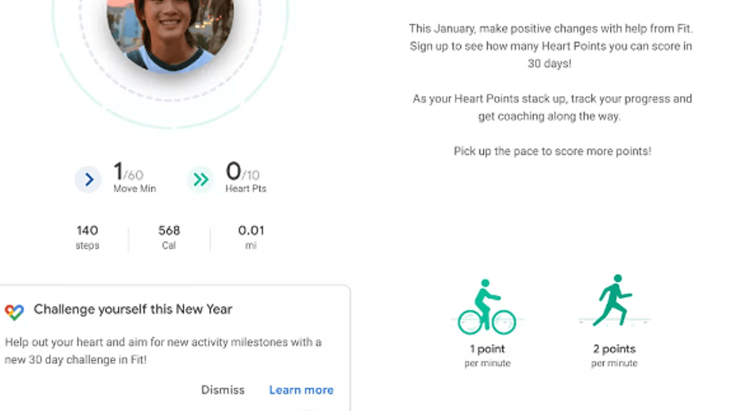 Google Fitin haasteet kestävät aina 30 päivää, ja niistä ensimmäinen keskittyy Heart Points -pisteiden ansaitsemiseen. Kuukauden aikana tavoitteena on kerätä kokoon 150 pistettä, joita voi ansaita liikkumalla. Googlen blogikirjoituksen mukaan tavallinen kävely tuottaa pisteen minuutissa, kun taas juoksemalla pisteitä tilille rapsahtaa minuuttia kohden kaksi.