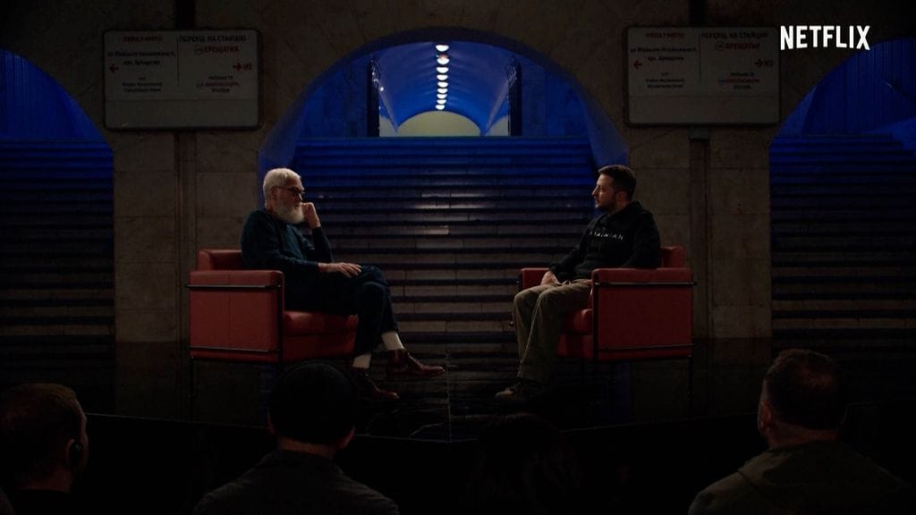 Haastattelun keskeyttää hälytyssireeni, joka kantautuu maanalaiseen tunneliin. Huolestunut amerikkalainen juontaja Letterman kääntyy presidentti Zelenskyin ja tiedustelee, miten heidän tulisi tehdä.