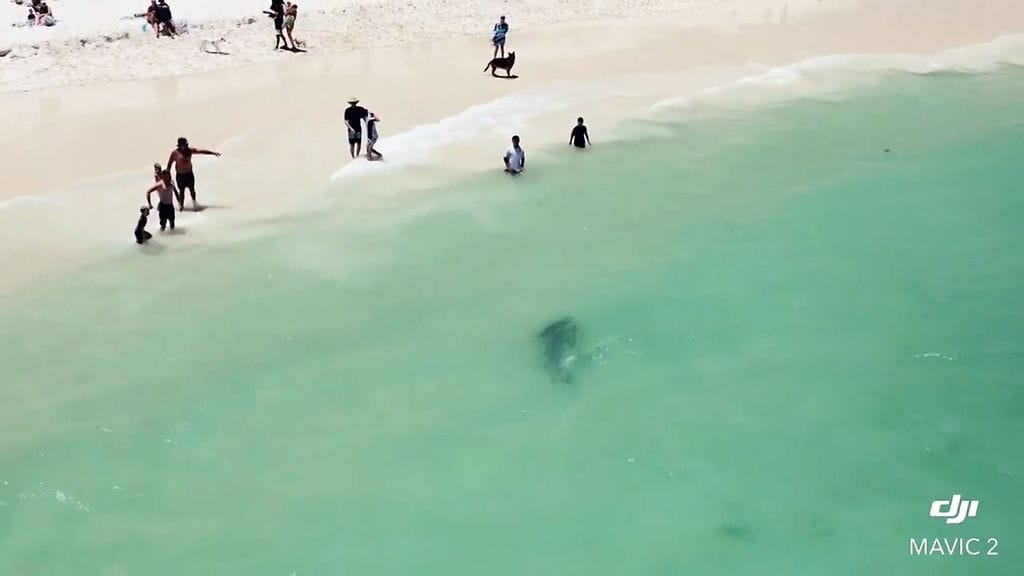 Yllä olevalla videolla Whitfordsin rannan ihmiset ja koirat Perthissä Australiassa poistuvat ripeästi vedestä, kun aivan rantaviivan tuntumassa vedessä näkyy valtava tumma hitaasti liikkuva hahmo. Vedessä uiva tumma varjo on tiikerihai.