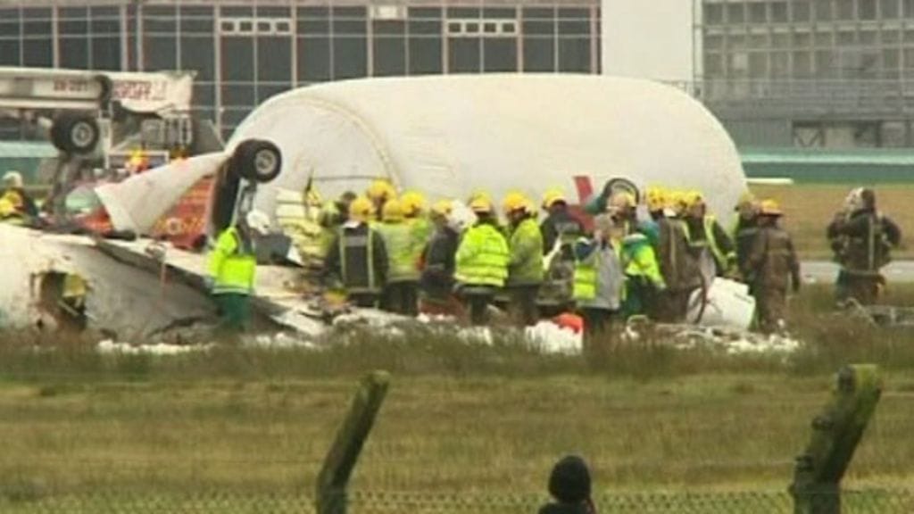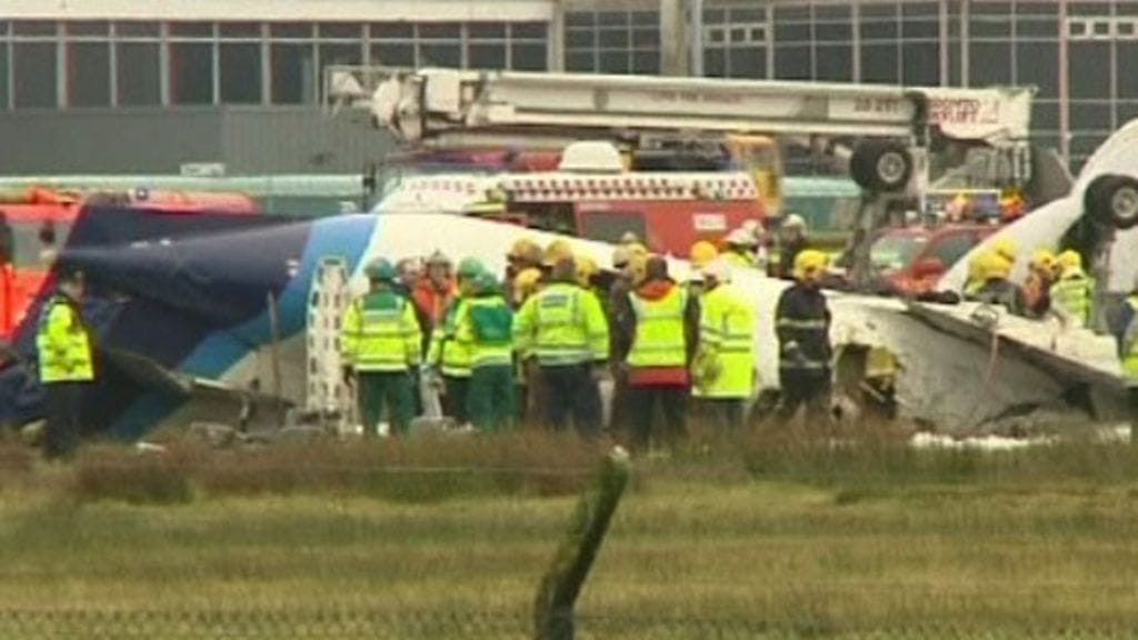Rikkoutuneen koneen osia on levinnyt suurelle alueella Corkin lentoasemalla. Paikalla on useita paloautoja ja ambulansseja.